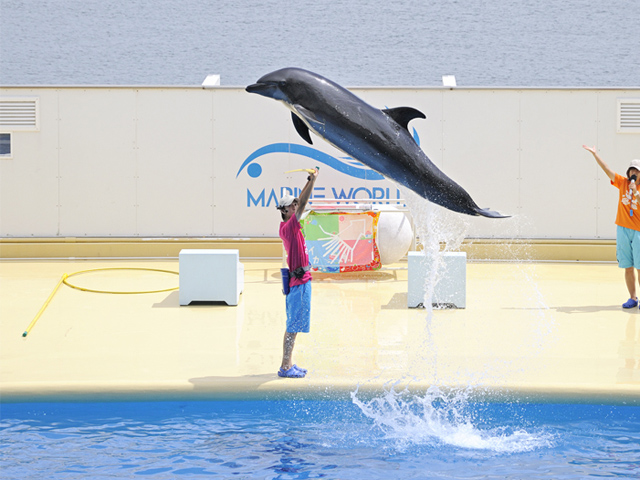 水族館のメインイベント「イルカ・アシカショー」は毎日開催。博多湾をバックに豪快で華麗なジャンプを連日披露してくれます。