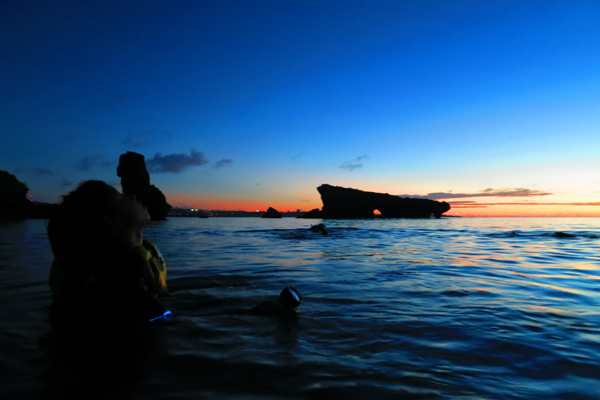 のんびり夕陽を眺めながら身も心も準備完了。海には輝く夜光虫。それはまさに小宇宙を感じさせる水中プラネタリウム。夜空を見上げれば光輝く満天の星空。波の音しか聞こえない夜の静寂な海に抱かれて、満天の星空を仰ぎ、夜光虫の発する神秘的な光に心癒されるナイトスノーケリング。